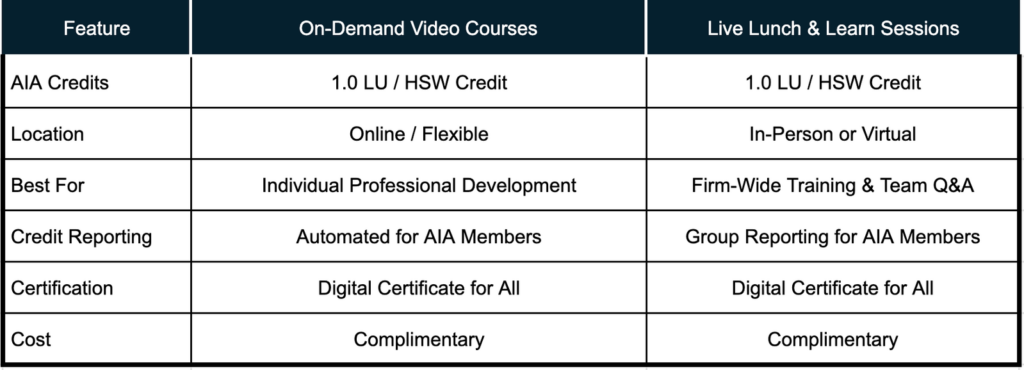 All sessions are registered for 1 AIA LU/HSW credit to support your professional continuing education requirements.